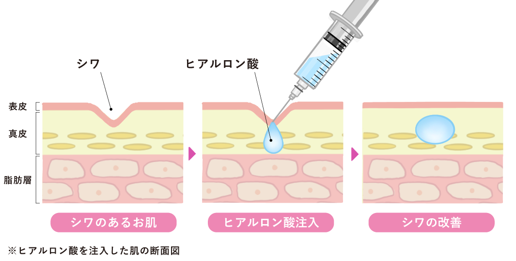 ヒアルロン酸は皮膚の真皮の中や関節、眼球の中など、体のさまざまな部位に存在し、細胞と細胞をつなぐ働きがあります。このように優れたヒアルロン酸ですが、残念なことに年を重ねるにつれてその量は減っていきます。加齢とともに肌の保水力は低下し、シワやたるみが出てくるのは当然のことで、それをカバーしてくれる治療法の一つがヒアルロン酸注入です。