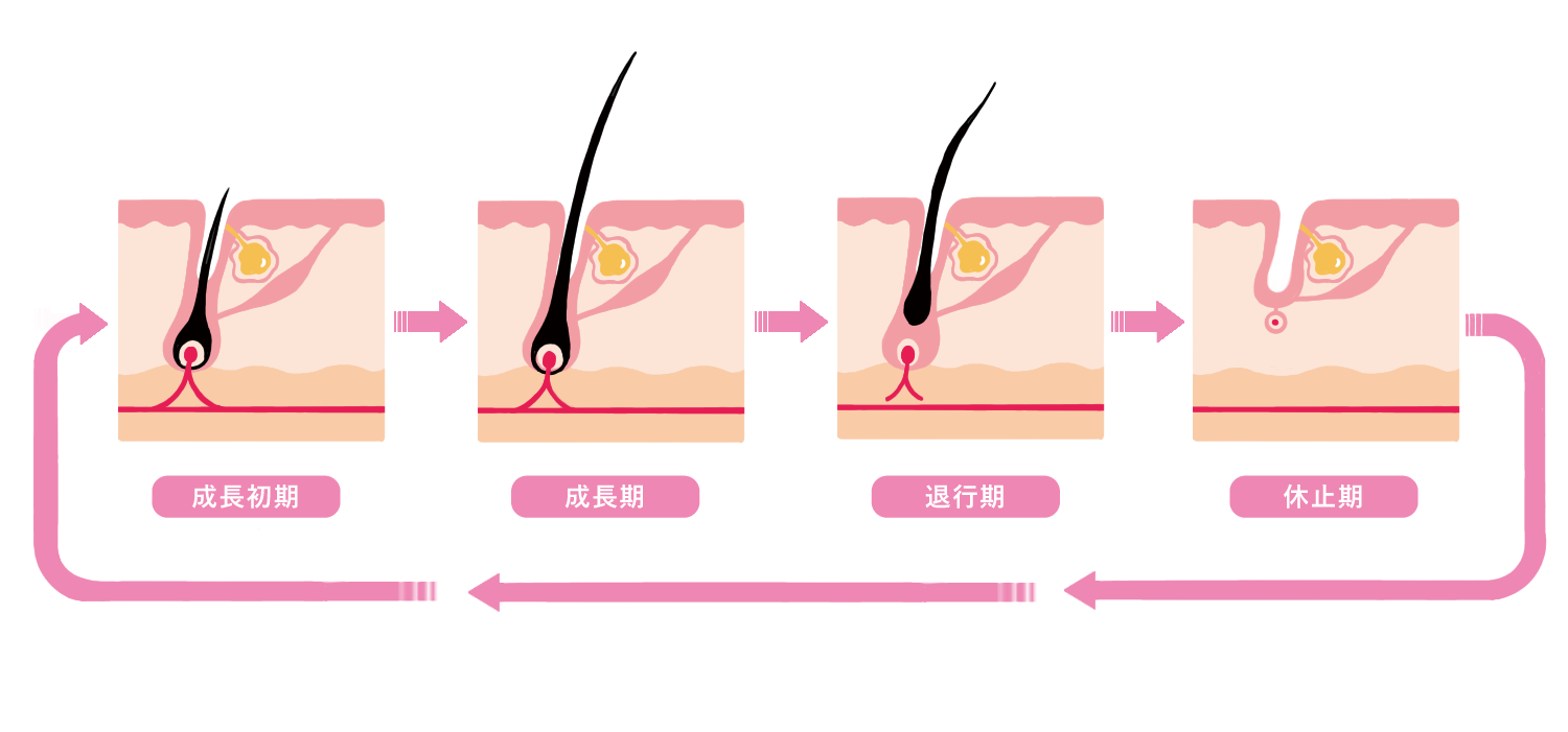 体毛は常に一定のサイクルで生え変わっており、毛周期は大きく分けて「成長期」「退行期」「休止期」3つの段階があります。